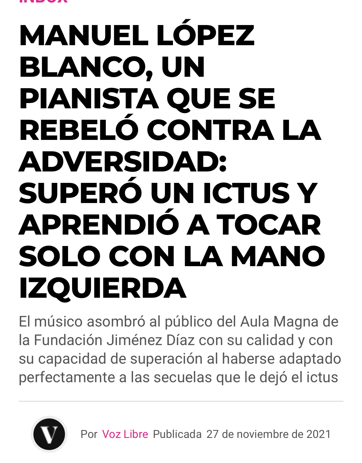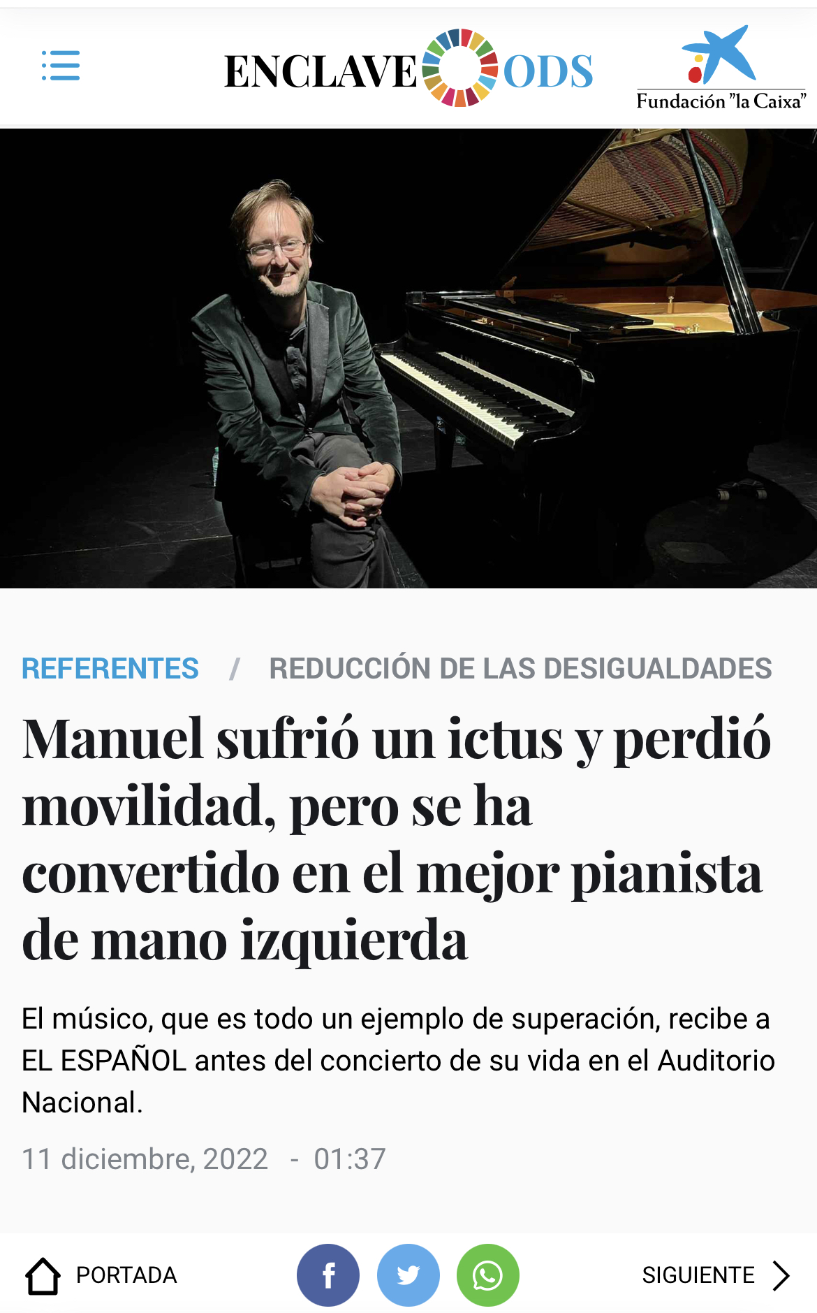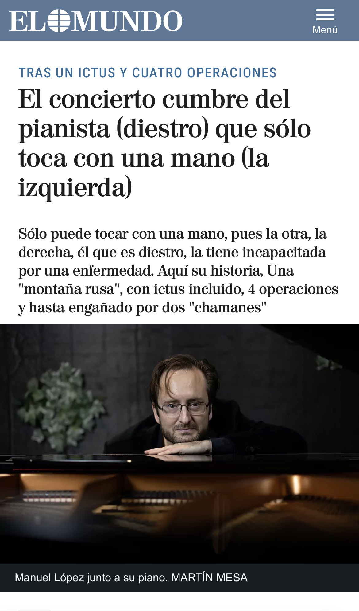 Manuel López ha actuado en escenarios tan emblemáticos como el Palau de la Música de Valencia, el Auditorio Nacional de Música de Madrid y los colegios de médicos de Madrid, Sevilla y Málaga. Su historia personal —superar la distonía focal y volver a tocar con la mano izquierda— es el argumento más poderoso de cada concierto.